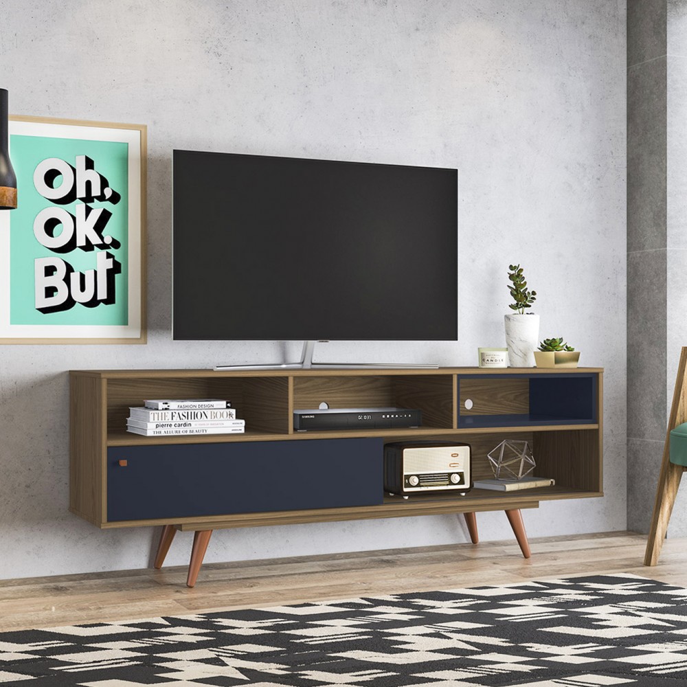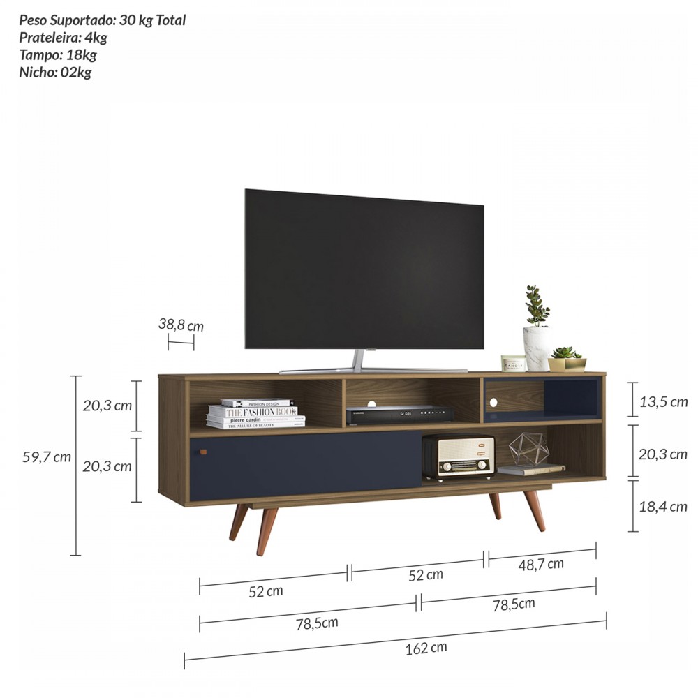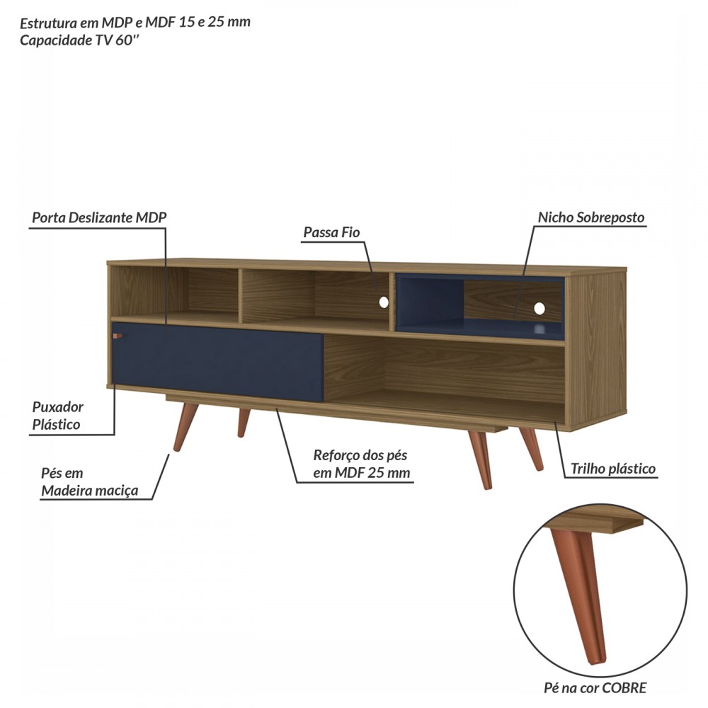O Rack Retrô Lyon é um móvel com uma linha retrô, onde tem como diferencial seus pés em madeira no formato palito. Possui uma porta deslizante e um nicho sobreposto, e mais quatro prateleiras para colocar objetos e eletrônicos com passa fio e um espaço ótimo para sua TV.