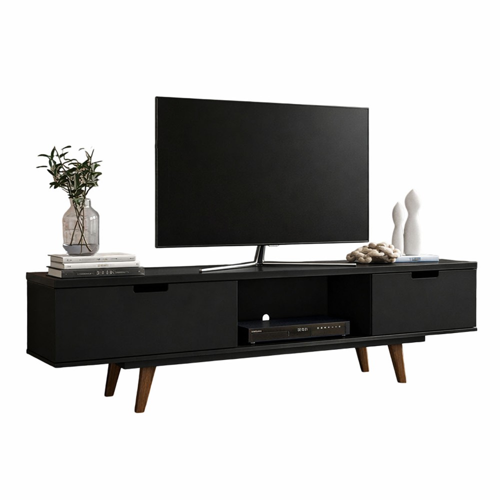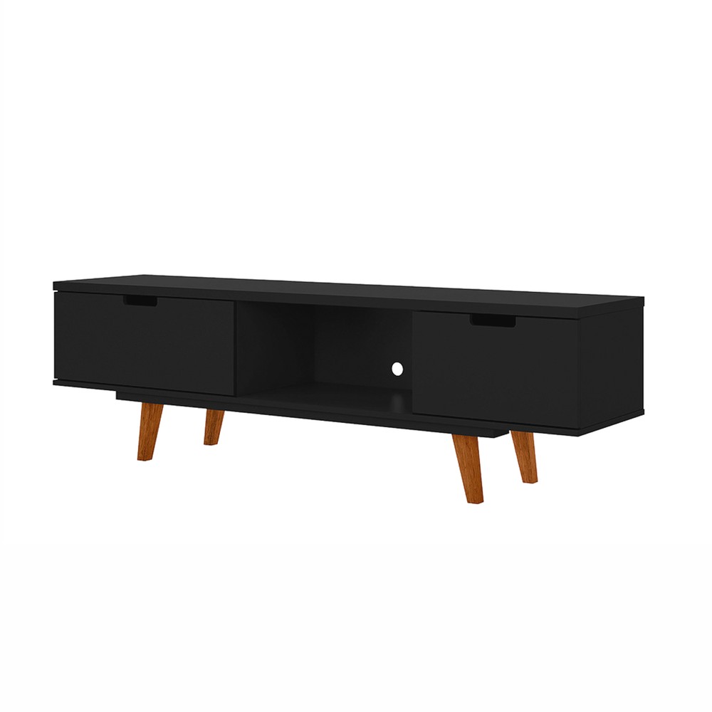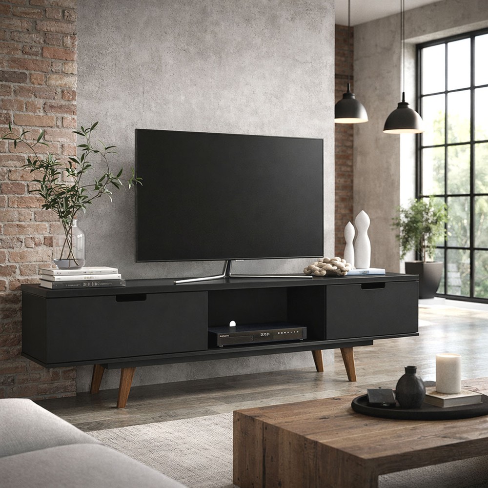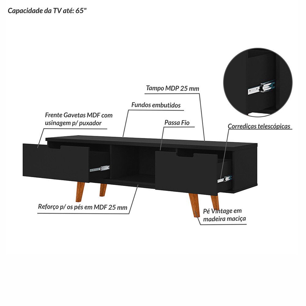 O Rack Retrô Vintage Box é um móvel de MDF e MDP de 15 e 25 mm, com uma pegada retrô, deixando seu ambiente diferente e com personalidade. Possui duas gavetas em MDF, com corrediças telescópicas metálicas e usinagem como puxadores. Um compartimento aberto para colocar objetos e eletrônicos e fundos traseiro embutidos. Possui um espaço ótimo para sua TV com passa fio e quatro pés vintage em madeira envernizada.