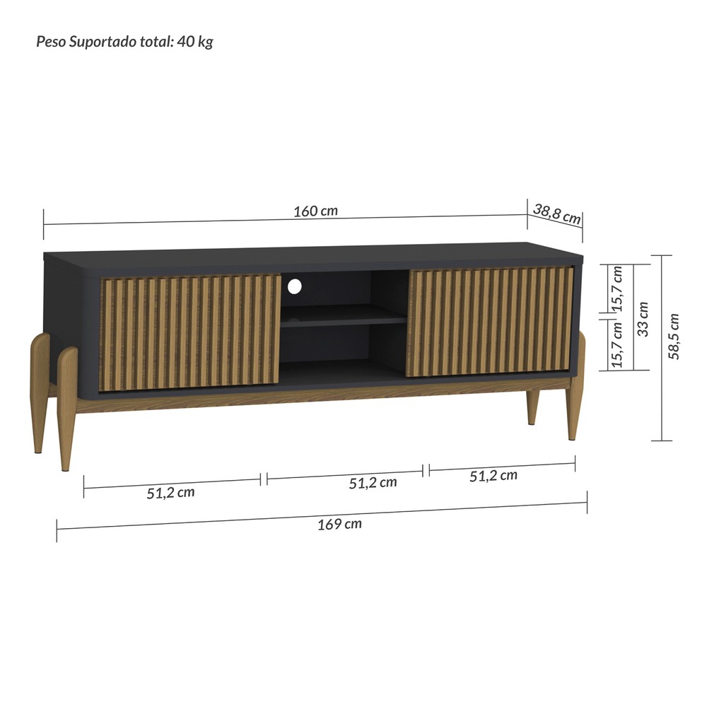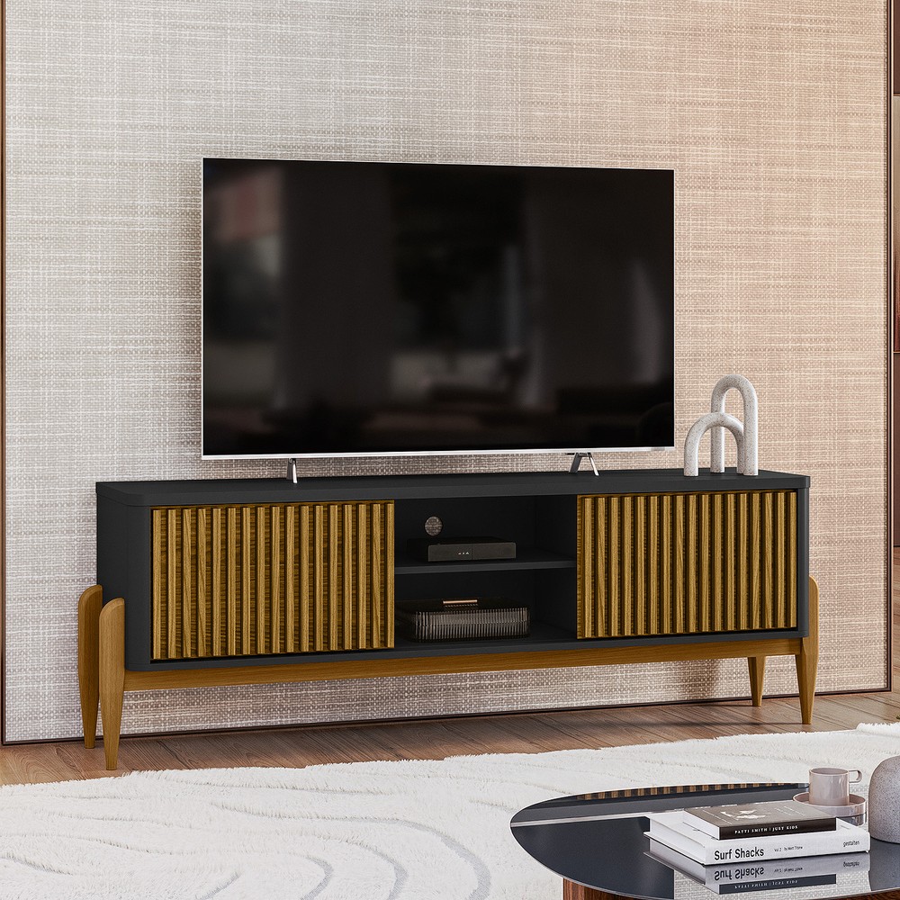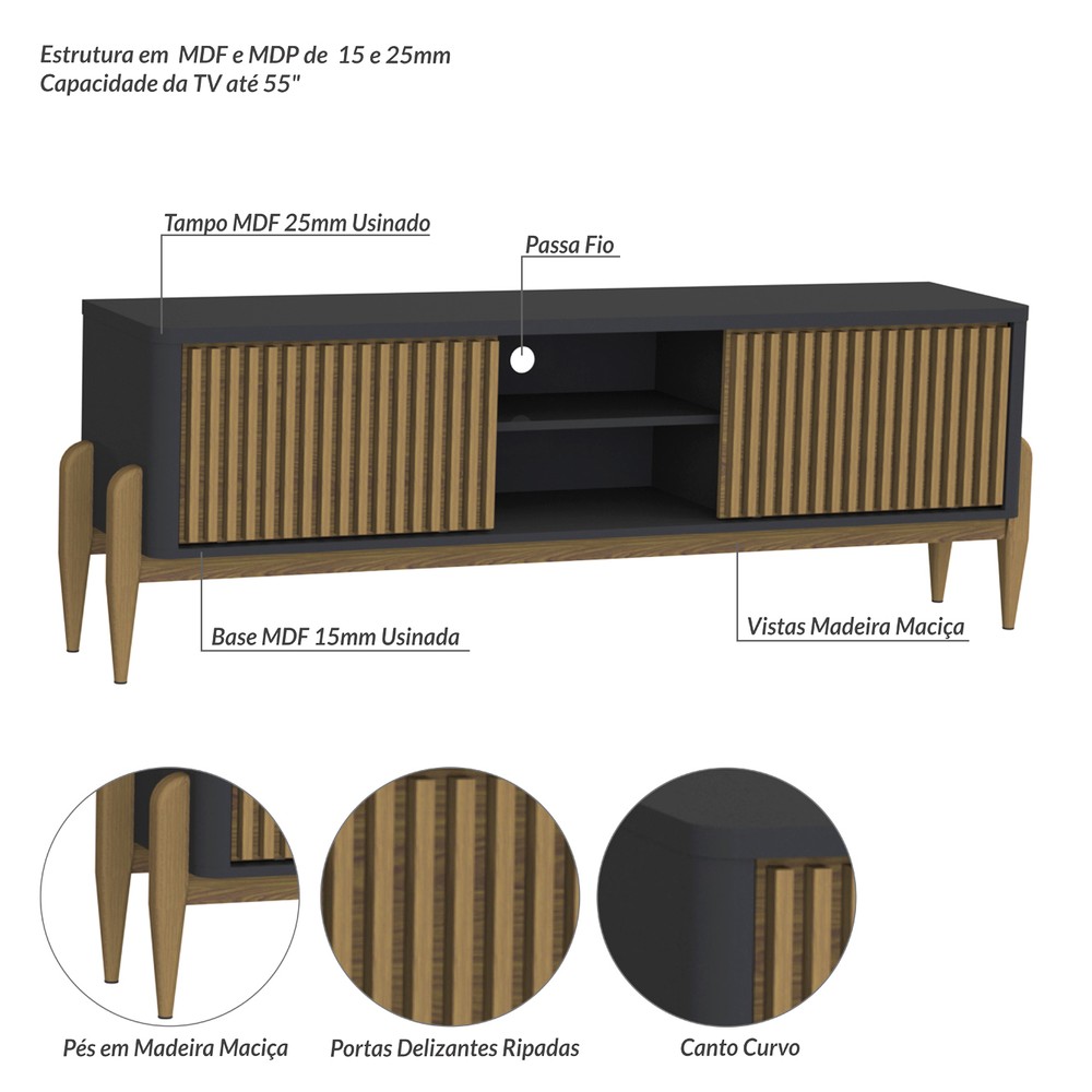 O Rack Sereno 1600mm é um produto com um design moderno e muito interessante, um dos seus diferenciais são os cantos curvos, as portas ripadas deslizantes, e os pés por fora das laterais, em madeira maciça encorpando e deixando o produto mais nobre, onde seu ambiente ficará agradável e aconchegante. Sua estrutura é em MDF e MDP de 15 e 25 mm com um tampo de 25 mm. É um produto com design de uma pegada contemporânea onde você personaliza seu ambiente deixando-o exclusivo.