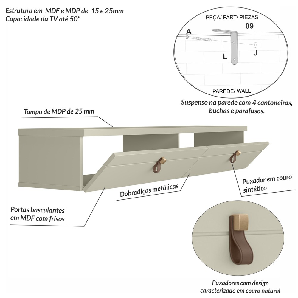 O Rack Suspenso Line 1350mm é um produto com um design moderno, possui duas portas basculantes em MDF com frisos e puxadores caracterizando o couro natural. Sua estrutura é em MDF e MDP de 15 E 25 mm, possui dois compartimentos internos. É um produto que você poderá instalar na parede de qualquer ambiente, no estilo contemporâneo, personalizando e deixando-o exclusivo.