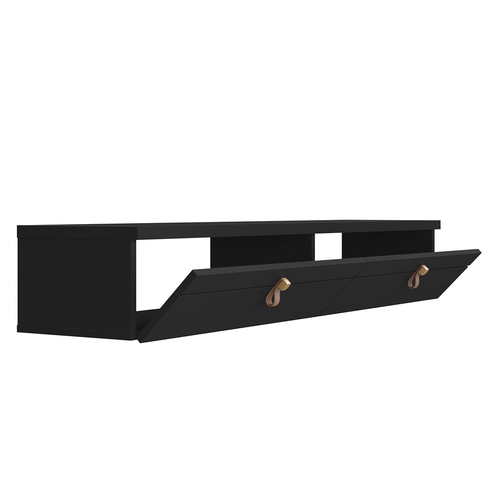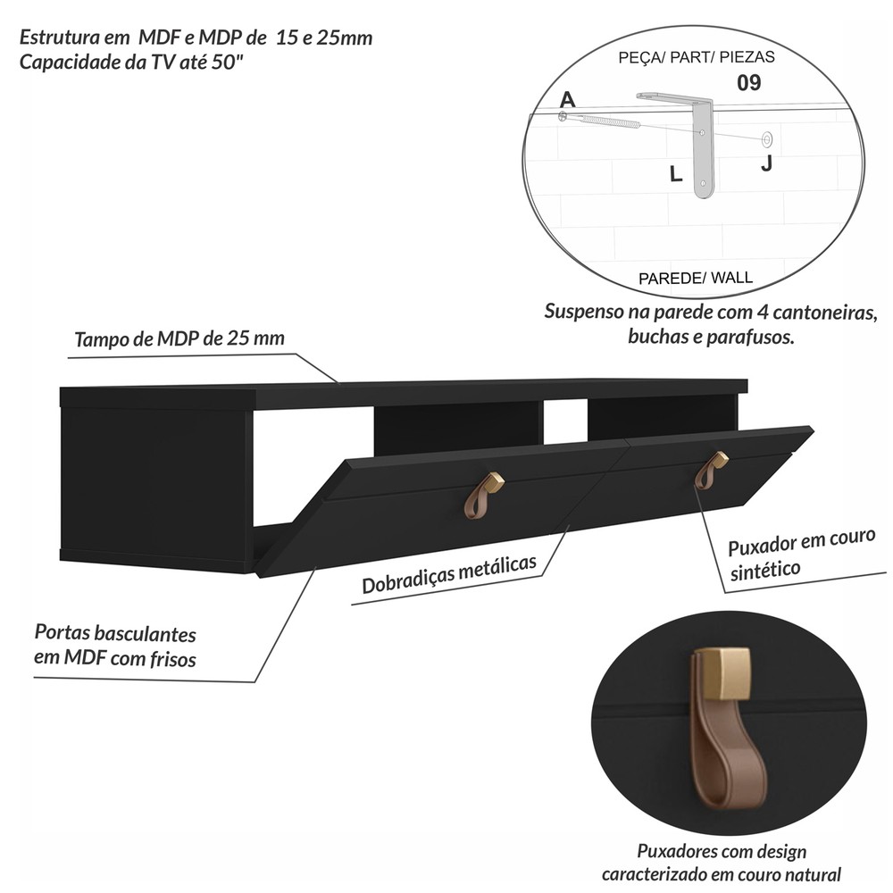 O Rack Suspenso Line 1350mm é um produto com um design moderno, possui duas portas basculantes em MDF com frisos e puxadores caracterizando o couro natural. Sua estrutura é em MDF e MDP de 15 E 25 mm, possui dois compartimentos internos. É um produto que você poderá instalar na parede de qualquer ambiente, no estilo contemporâneo, personalizando e deixando-o exclusivo.