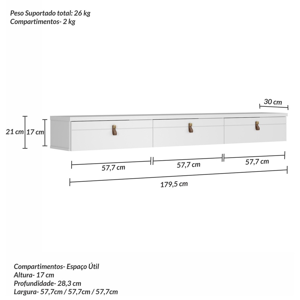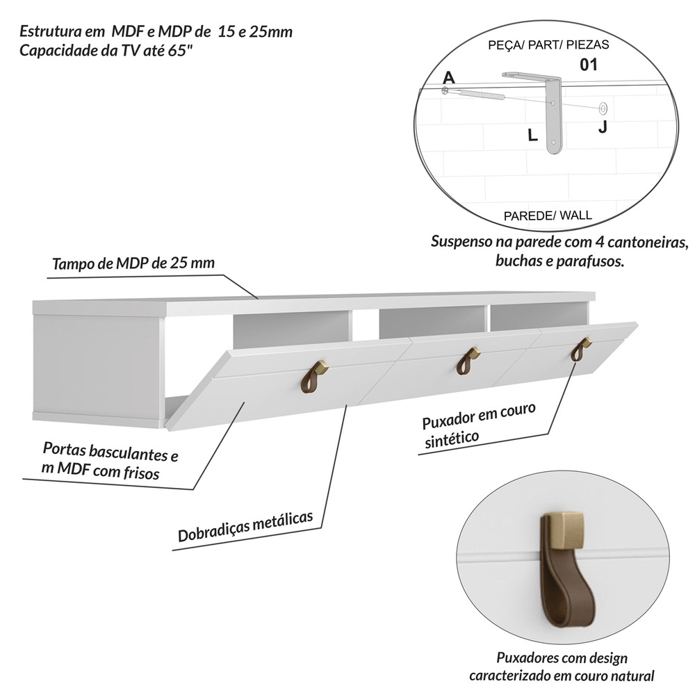 O Rack Suspenso Line 1795mm é um produto com um design moderno, possui três portas basculantes em MDF com frisos e puxadores caracterizando o couro natural. Sua estrutura é em MDF e MDP de 15 e 25mm, possui três compartimentos internos. É um produto que você poderá instalar na parede de qualquer ambiente, no estilo contemporâneo, personalizando e deixando-o exclusivo.