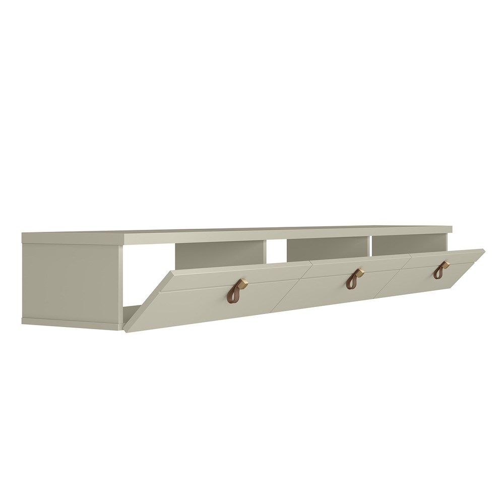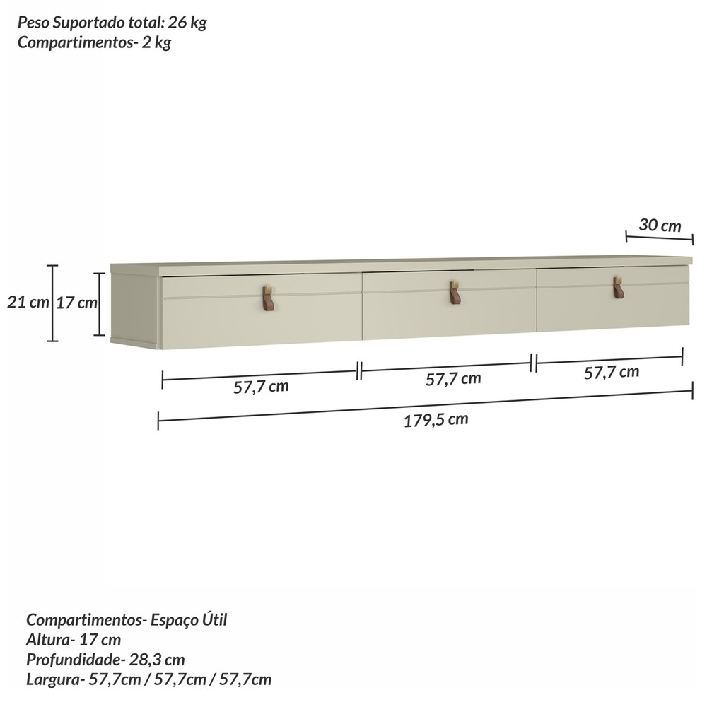 O Rack Suspenso Line 1795mm é um produto com um design moderno, possui três portas basculantes em MDF com frisos e puxadores caracterizando o couro natural. Sua estrutura é em MDF e MDP de 15 e 25mm, possui três compartimentos internos. É um produto que você poderá instalar na parede de qualquer ambiente, no estilo contemporâneo, personalizando e deixando-o exclusivo.
