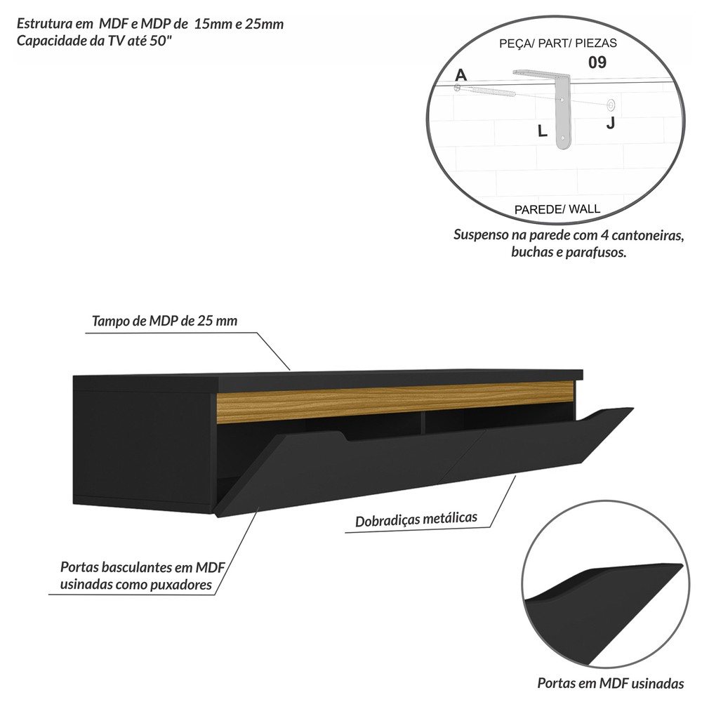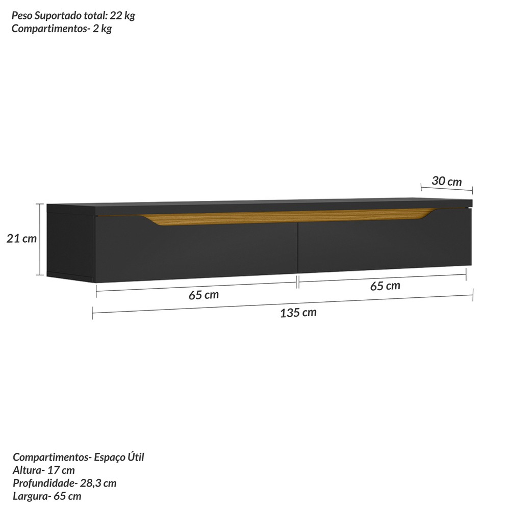 Rack Suspenso Uno P/ Tvs Até 50 Polegadas 135cm 2 Portas Preto/Cedro - Olivar Móveis