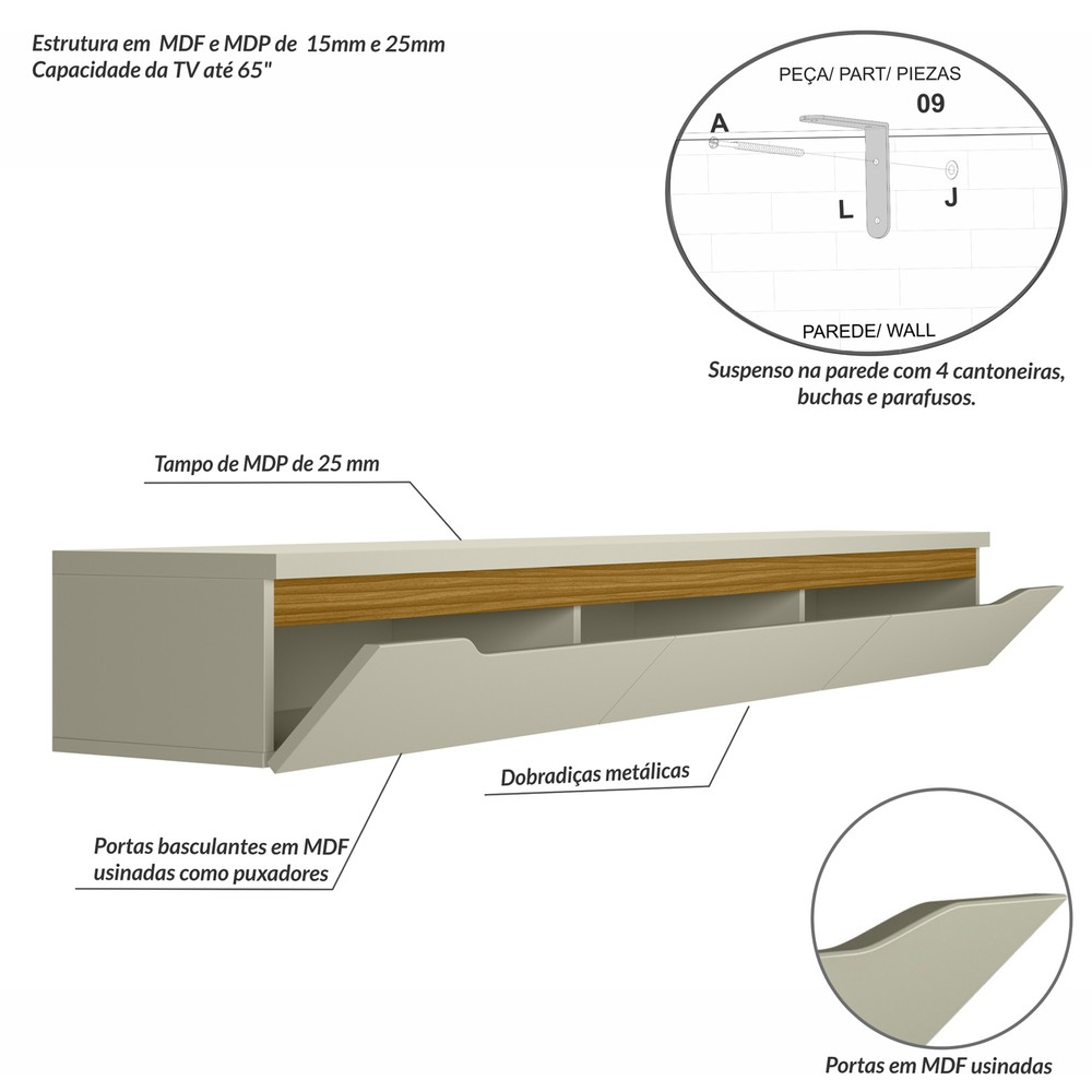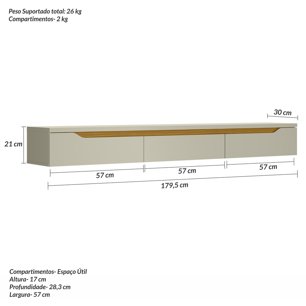 O Rack Suspenso Uno 1795mm é um produto com um design diferenciado, possui três portas basculantes usinadas para servir de puxadores e uma vista amadeirada. Sua estrutura é em MDF e MDP de 15 e 25 mm, possui três compartimentos internos. É um produto que você poderá instalar na parede de qualquer ambiente, no estilo contemporâneo, personalizando e deixando-o exclusivo.