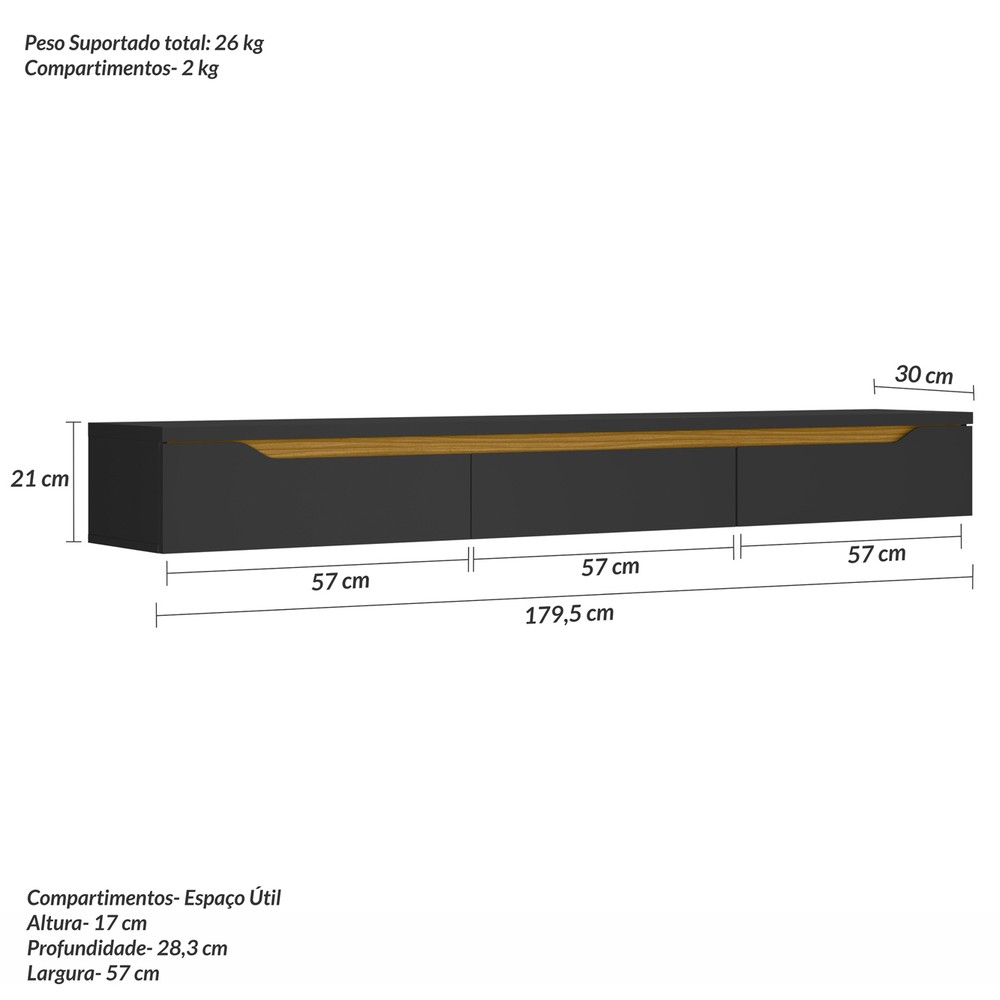 O Rack Suspenso Uno 1795mm é um produto com um design diferenciado, possui três portas basculantes usinadas para servir de puxadores e uma vista amadeirada. Sua estrutura é em MDF e MDP de 15 e 25 mm, possui três compartimentos internos. É um produto que você poderá instalar na parede de qualquer ambiente, no estilo contemporâneo, personalizando e deixando-o exclusivo.