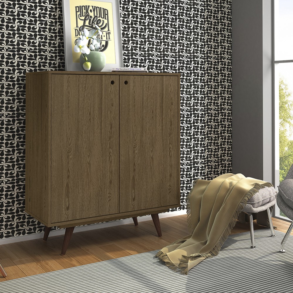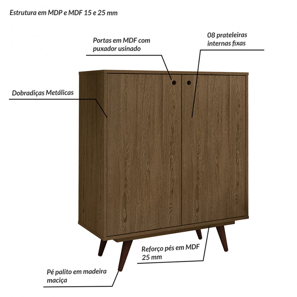 A Sapateira Retrô 50, possui portas de rotação em MDF, prateleiras para acomodação de diversos sapatos (20 pares). Possui pés palito em madeira, trazendo o design Retrô.